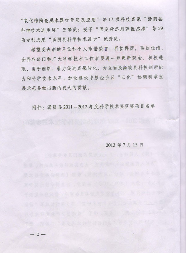 关于表彰2011-2012年度汤阴县科学技术进步奖的决定